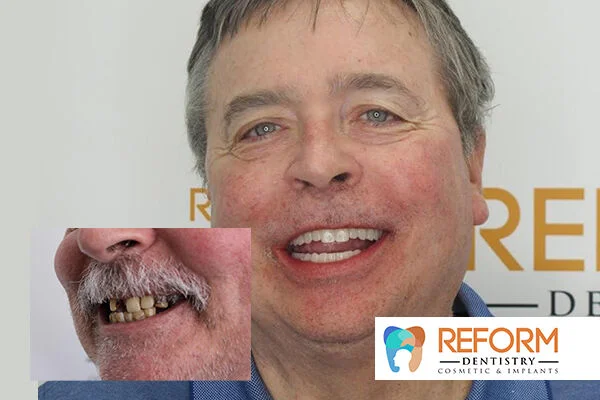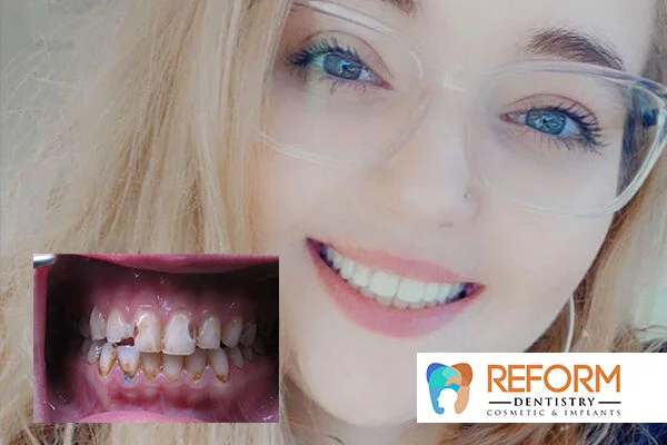 Cada foto muestra a un paciente real de Reform Dentistry con su resultado anterior insertado. Haga clic en cualquier foto para verla a tamaño completo.